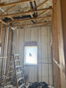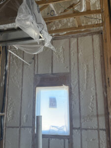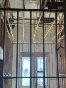 For this project, we applied 5.5 inches of open-cell spray foam in the walls and 6 inches in the roofline. Open-cell spray foam was the perfect solution here, offering an air-tight seal that will help regulate interior temperatures, reduce outside noise, and improve overall energy efficiency for the building.